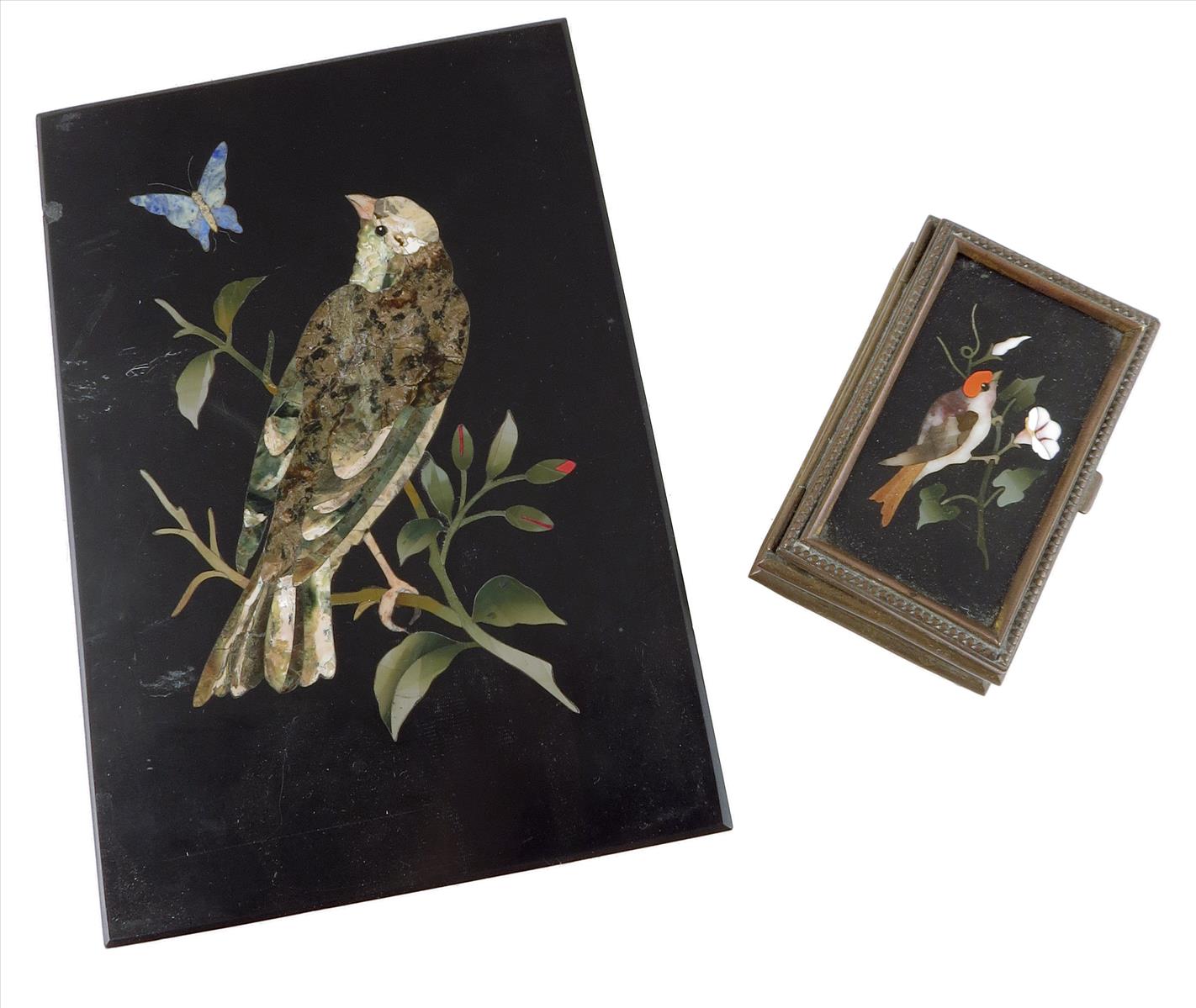 A late 19th century ornithological pietra dura panel, 7½in (5cm) high, 19in (12.6cm) wide, and a small brass box similar inset pietra dura lid, 1½in (3.8cm) high, 3½in (8.5cm) wide. (2)