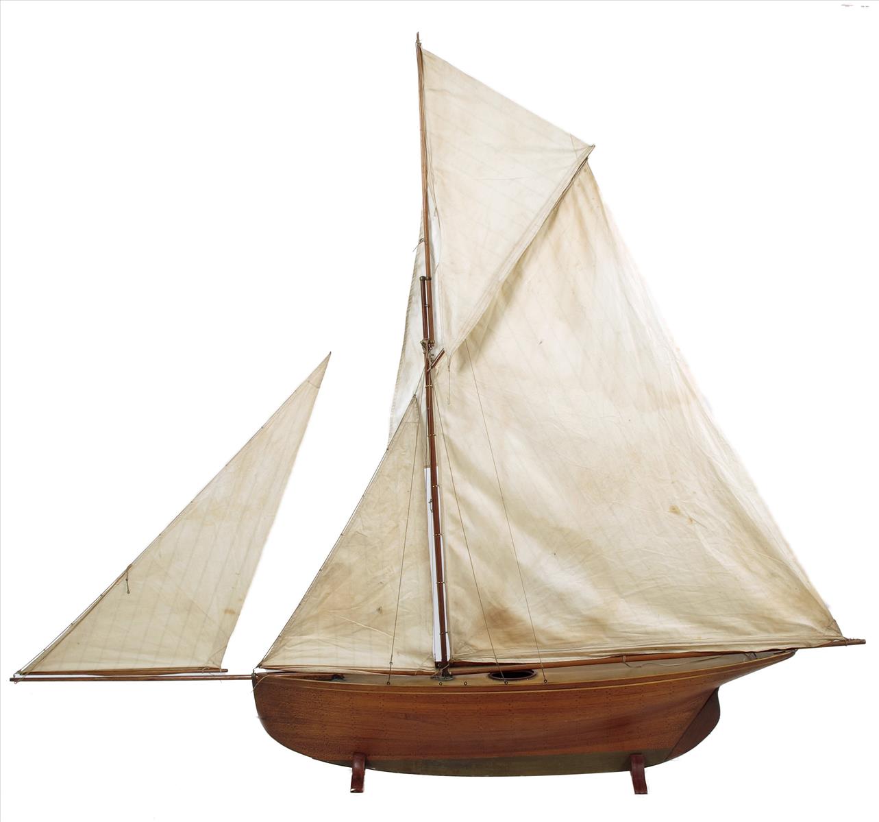 An early 20th century pond yacht, with a planked hull, single mast and cloth sails, 63in (160cm) high, 68½in (173.7cm) wide.