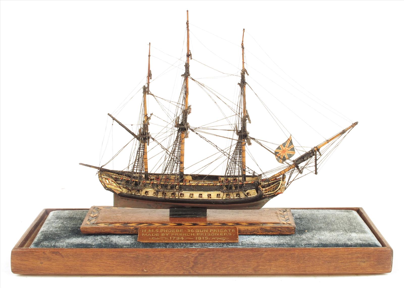 A 19th century French Prisoner of War carved wood and polychrome model of H.M.S. Phoebe, a thirty-six gun frigate, fully rigged with a planked deck, with brass cannon and a carved figurehead, on a chevron banded stand, with a later title plaque and glazed case, 6½in (16.5cm) high, 8½in (21.4cm) wide, 3¼in (8.1cm) deep.