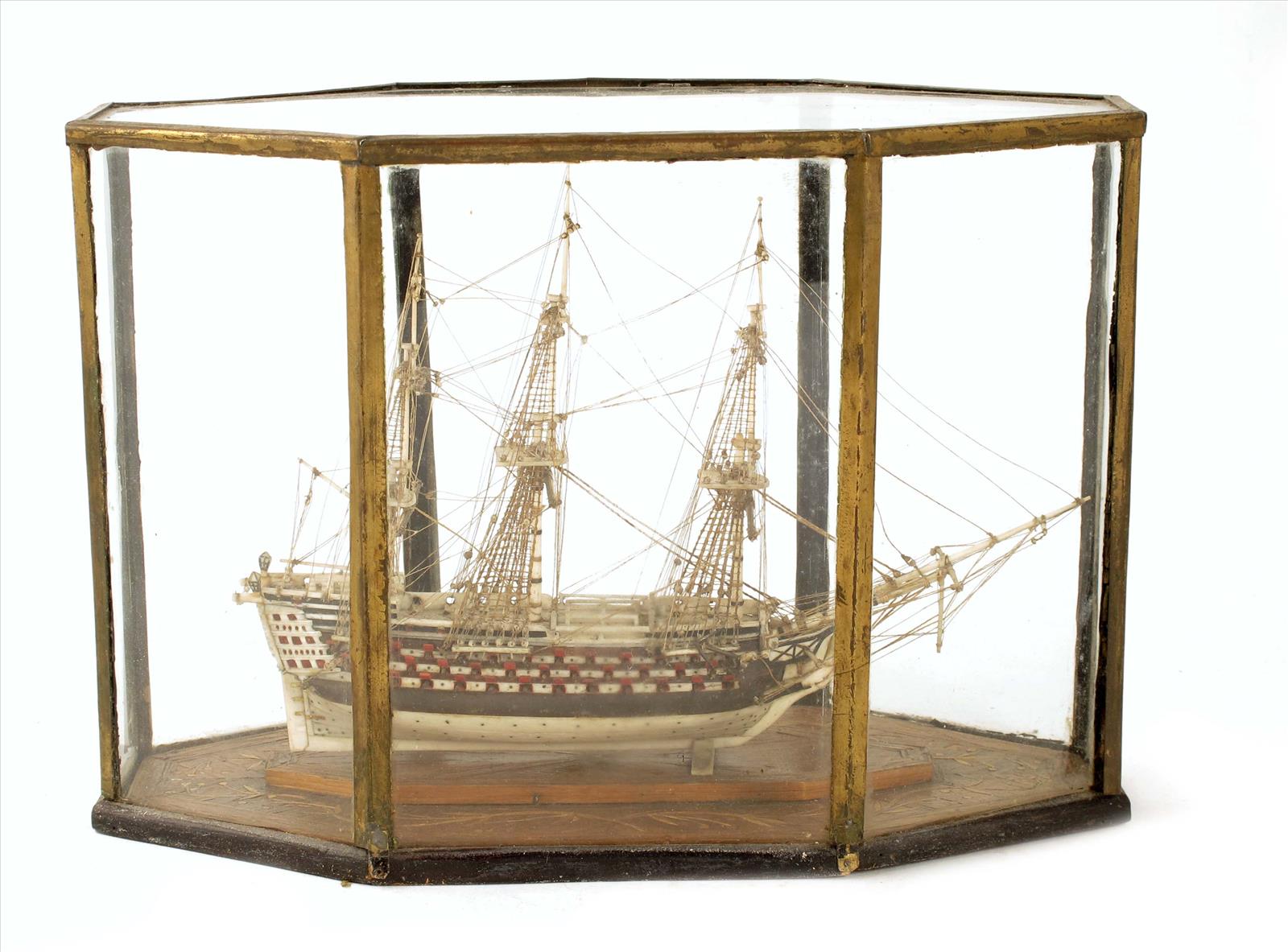 An early 19th century French Prisoner of War bone and baleen model of a ninety gun ship of the line, fully rigged with pinned and planked hull and brass cannon, standing on a stepped straw-work marquetry base within a glazed and brass framed octagonal case, 6½in (16cm) high, 9¼in (23.3cm) wide, 4½in (11.6cm) deep.