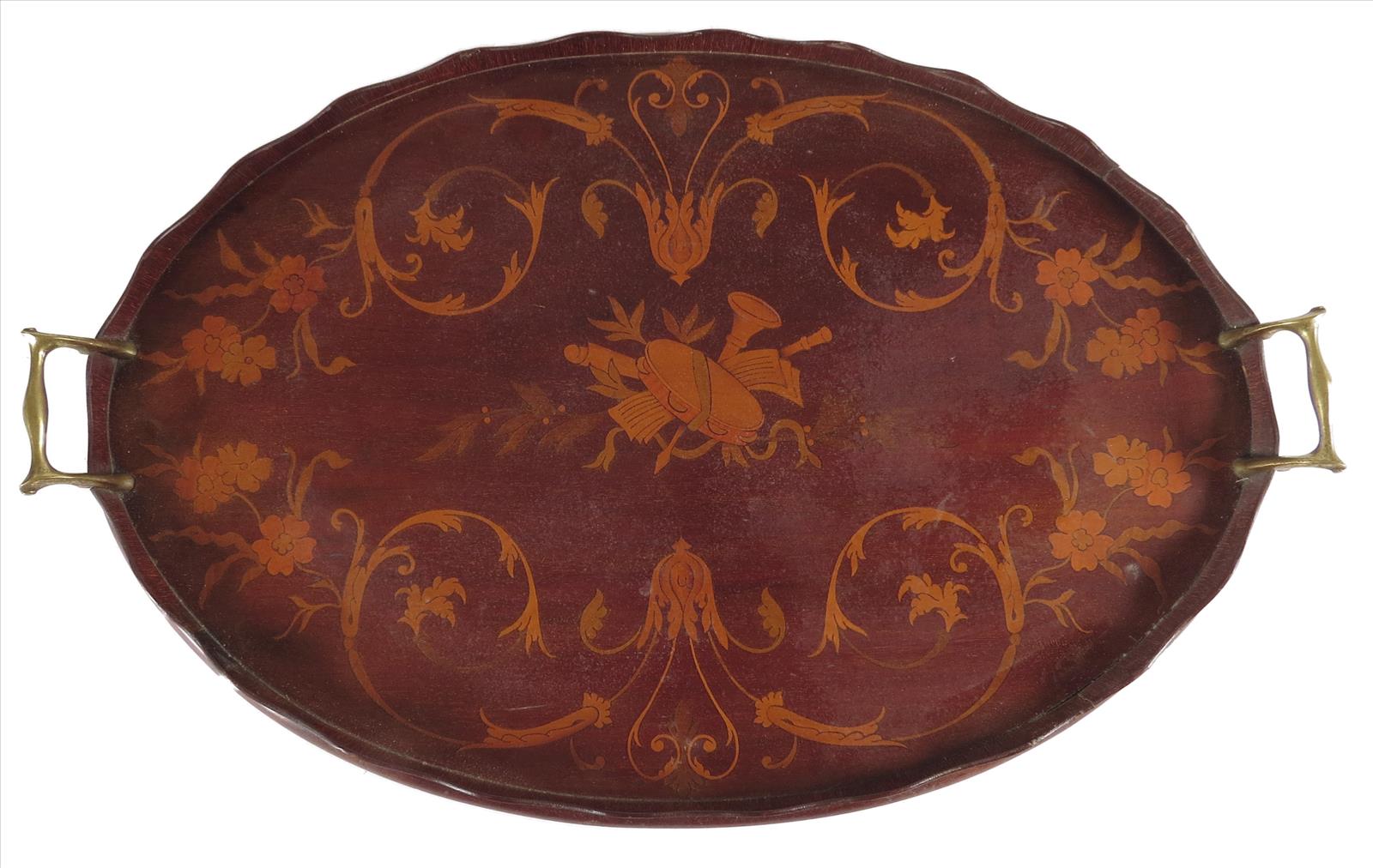 An Edwardian mahogany and marquetry oval drinks tray, with brass carrying handles, 23in (58.5cm) wide.