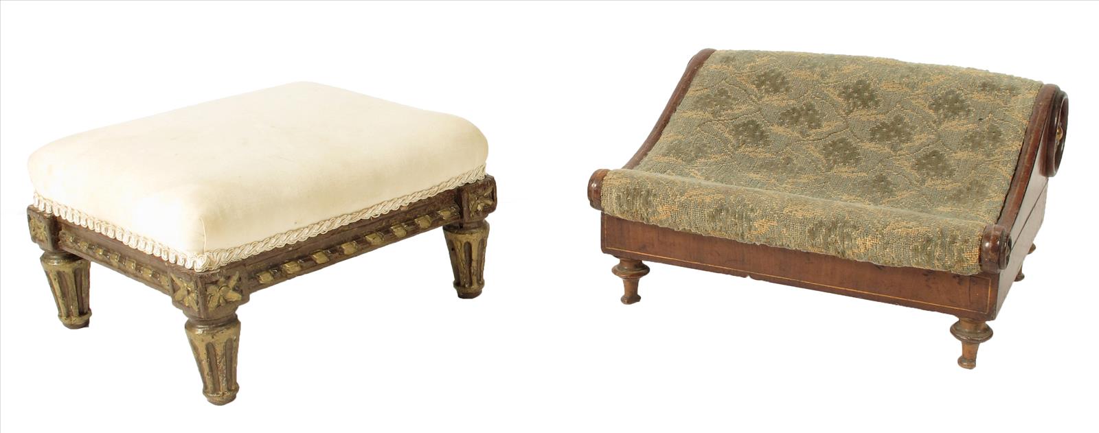 A 19th century French mahogany gout stool, with stringing and gilt brass star mounts, 7in (18cm) high, 13½in (34.2cm) wide, 11¾in (30cm) deep, and a parcel giltwood rectangular foot stool. (2)