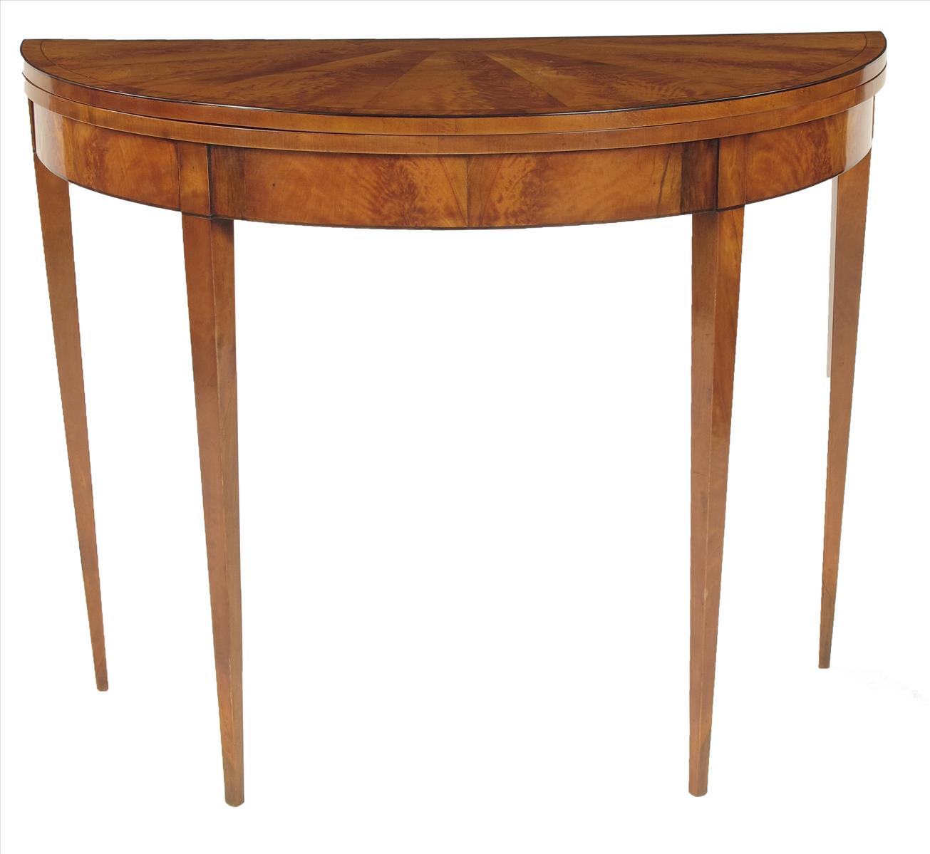 A late 19th century satinwood card table, with segmented and crossbanded top with fine stringing, baize lined, on twin gates, 28¾in (73cm) high, 36¼in (92cm) wide, 17¾in (45cm) deep.