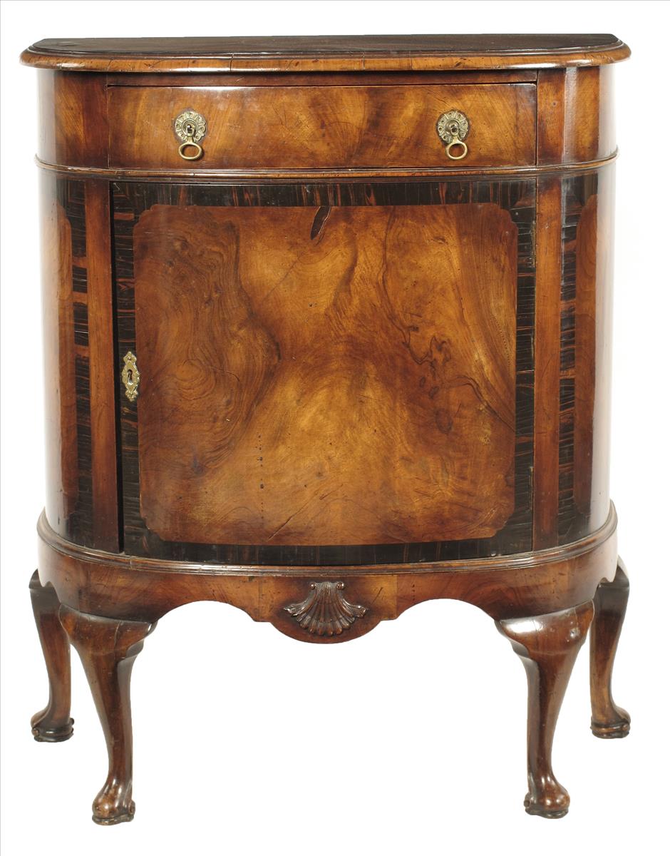 A late 19th century walnut and coromandel banded bowfront side cabinet, with a frieze drawer above a cupboard, 36in (91.8cm) high, 31½in (80cm) wide, 15in (37.8cm) deep.