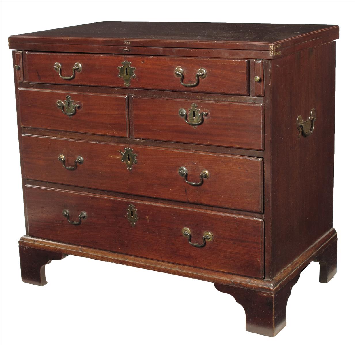 A mid 18th century mahogany bachelor's chest, with a hinged fold-over top above an arrangement of three long and two short drawers on bracket feet, with side carrying handles, 33in (84cm) high, 37¼in (94.5cm) wide, 20¾in (52.5cm) deep.