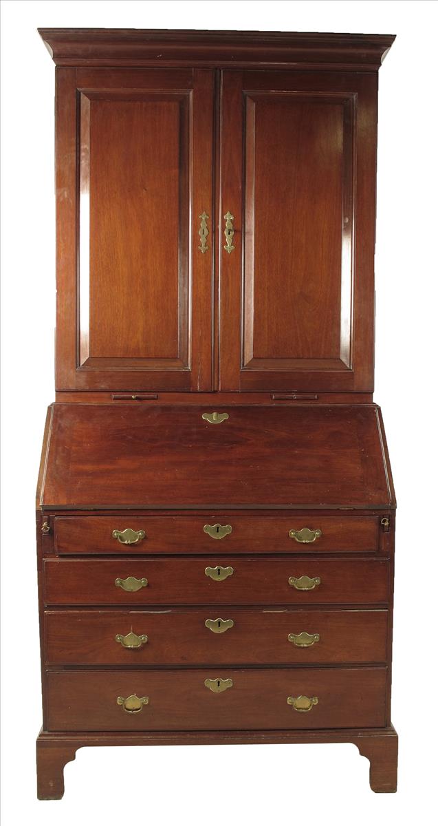 A George II mahogany bureau bookcase, the moulded cornice above a pair of fielded panel doors, enclosing three adjustable shelves above pull-out candle slides, the hinged fall enclosing an arrangement of pigeon holes and drawers, with two secret pilaster compartments flanking a panelled door, above a well with a sliding cover above four long graduated drawers on bracket feet, 86in (218.5cm) high, 40¾in (103.5cm) wide, 22½in (57.2cm) deep.