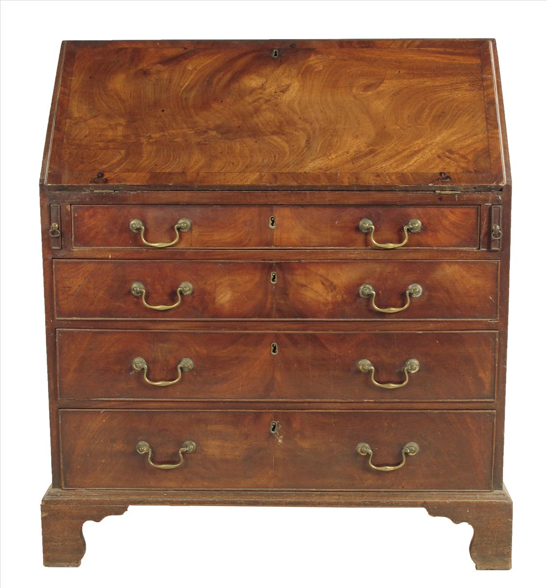 A George III mahogany bureau possibly by Thomas Chippendale, the crossbanded fall revealing drawers and pigeon holes, above four long graduated drawers each with a 'S' shape keyhole and bracket feet, 42in (106.6cm) high, 37¾in (95.5cm) wide, 20¾in (52.5cm) deep.