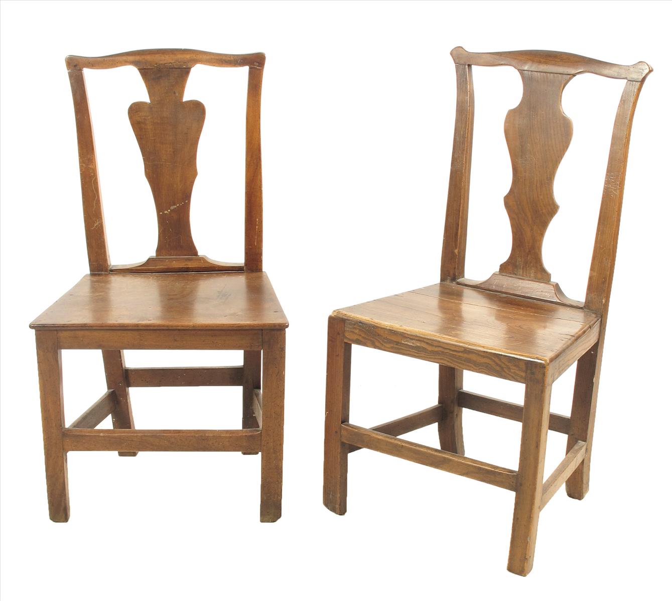 A set of six George III East Anglian elm and fruitwood chairs, each with a vase shaped splat to a solid seat, together with a similar chair. (7)