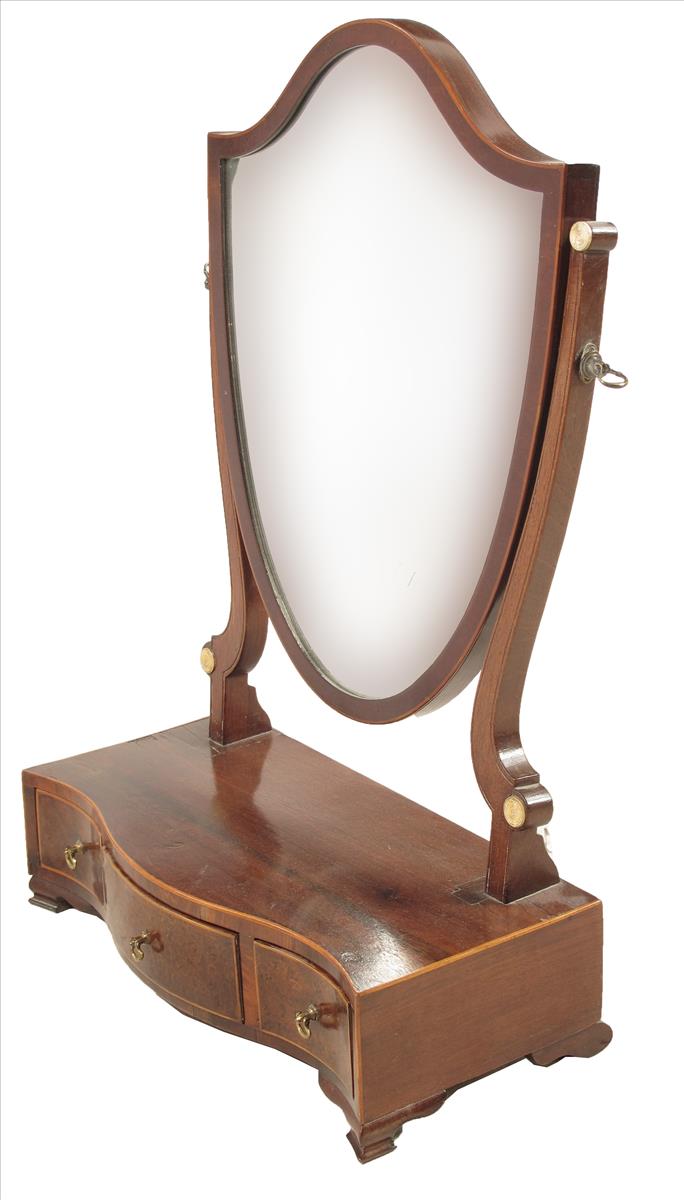 A mahogany shield shape toilet mirror, with boxwood edging and applied bone rondels, the serpentine front drawers with burr oak veneers, 24¼in (61.5cm) high, 16½in (42cm) wide, 8in (20.2cm) deep.