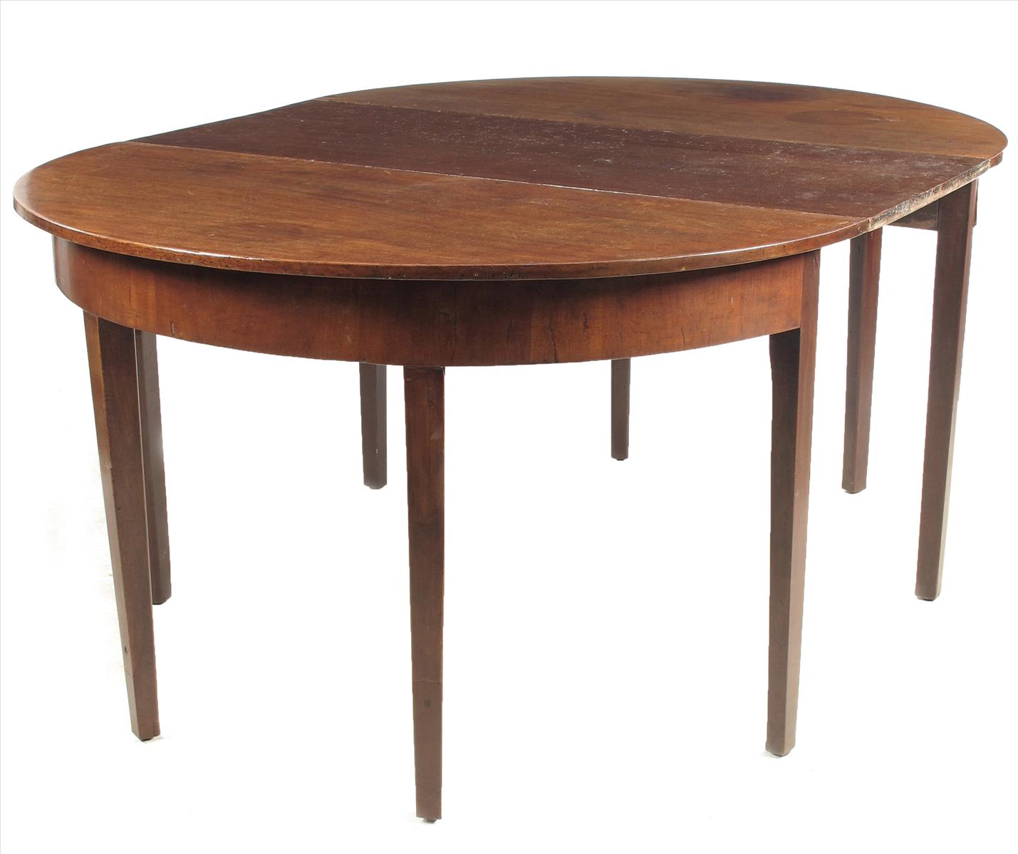 A George III mahogany dining table, comprising a pair of demi-lune ends and a single leaf, 28½in (72cm) high, 66½in (169cm) wide, 47¼in (120.2cm) deep.