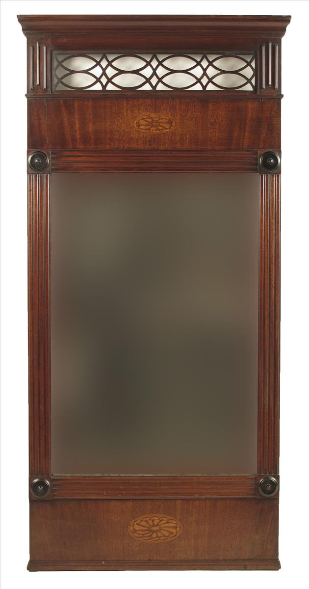 A 19th century continental mahogany wall mirror, with a pierced frieze and two marquetry paterae panels and a bevelled plate, 51ΒΌ x 25in (130 x 63.5cm).