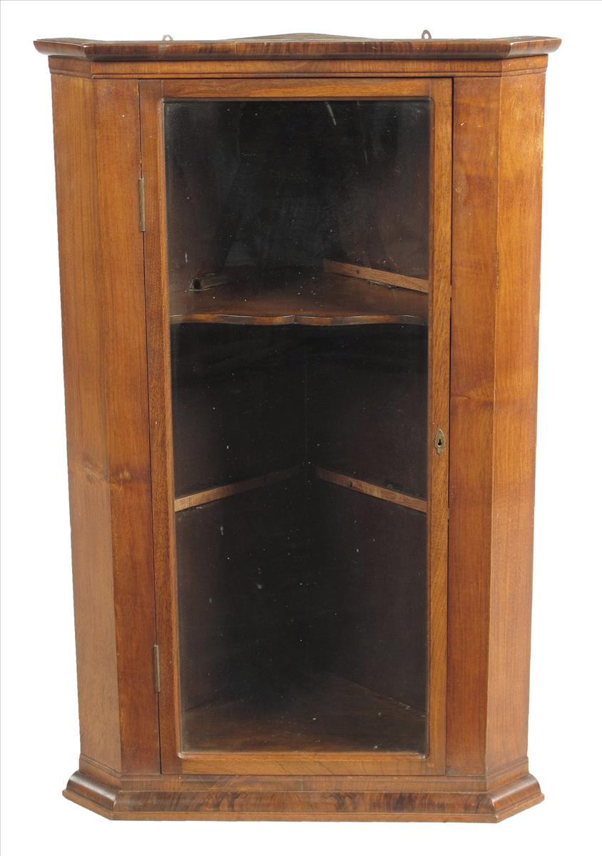 A walnut hanging corner cupboard, with two arc d'arbelet front shelves, 31¾in (80.6cm) high, 20½in (52cm) wide, 12½in (31.7cm) deep.