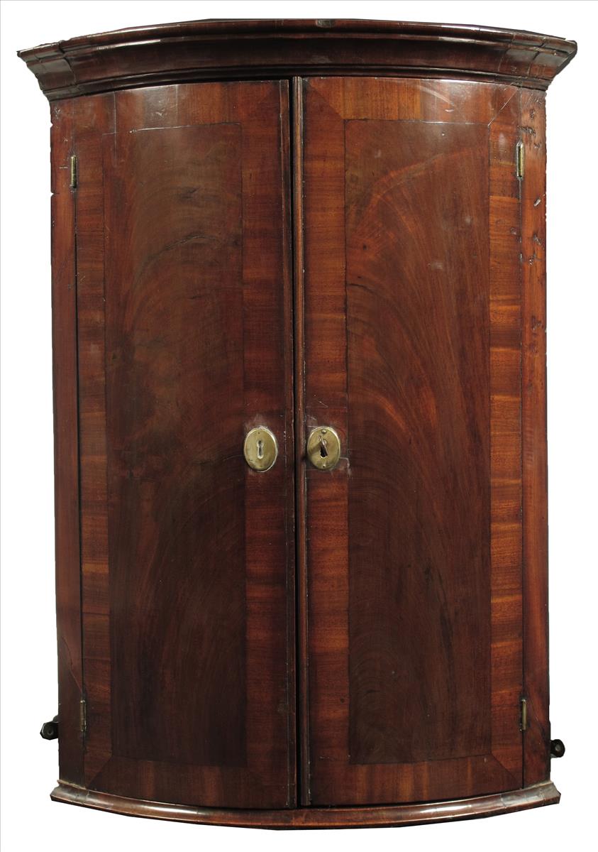 A George III mahogany bowfront hanging corner cupboard, with two shelves and two spice drawers flanked by two false drawers, 30¼in (77cm) high, 22in (56cm) wide, 14½in (37cm) deep.