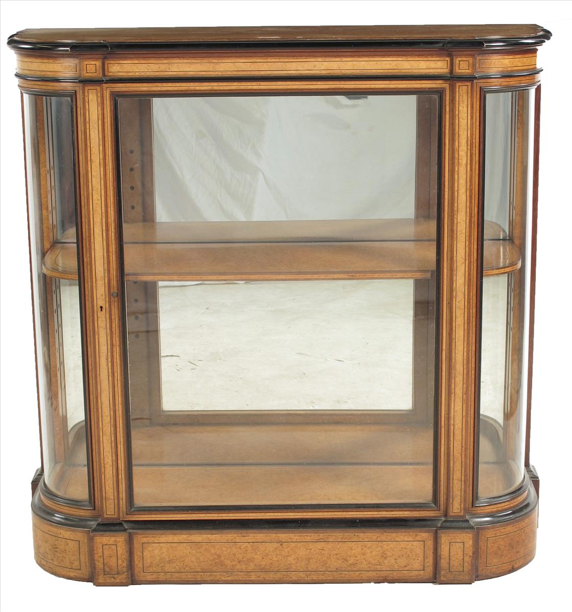 A Victorian amboyna breakfront side cabinet, with ebonised edging and purple heart banding, the interior with a mirror back and an adjustable shelf, 36¾in (93.4cm) high, 37½in (95cm) wide, 14¾in (37.3cm) deep.