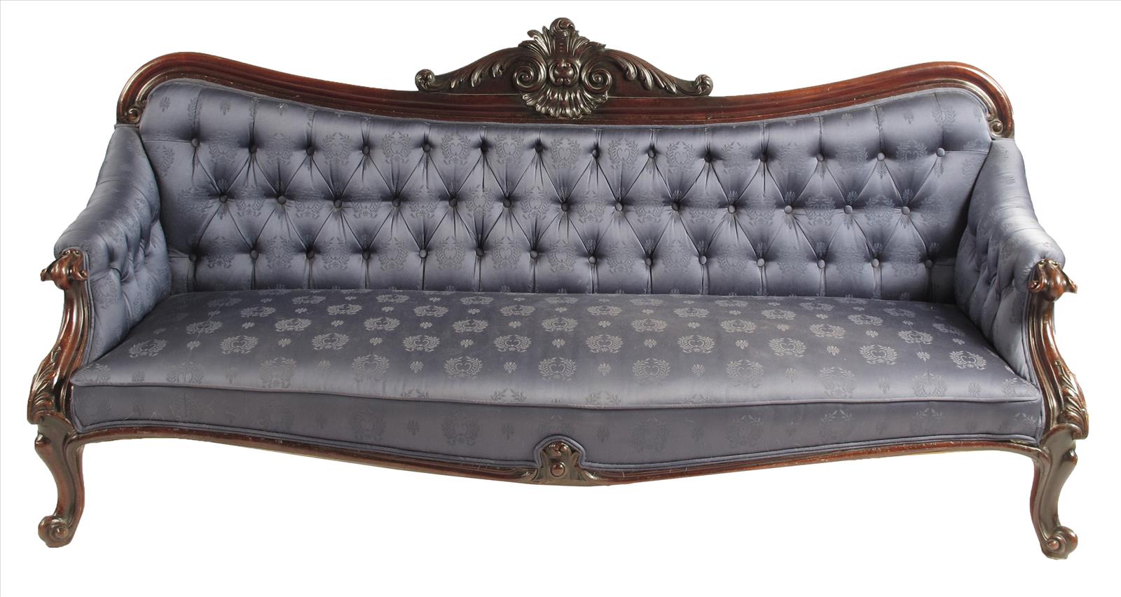 A 19th century carved mahogany show frame sofa, with a button back and covered with laurel wreath pattern fabric, 38¼in (96.8cm) high, 79½in (201.8cm) wide, 26½in (67.2cm) deep.