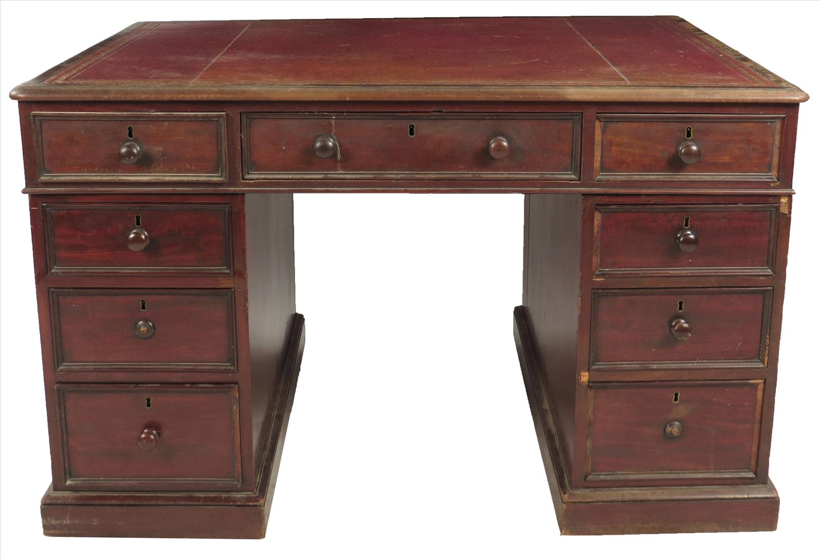 A Victorian mahogany partners desk, with a replaced gilt tooled red leather inset top, the reverse with frieze drawers above cupboard doors enclosing shelves, 29½in (75cm) high, 48in (122cm) wide, 36in (91.5cm) deep.