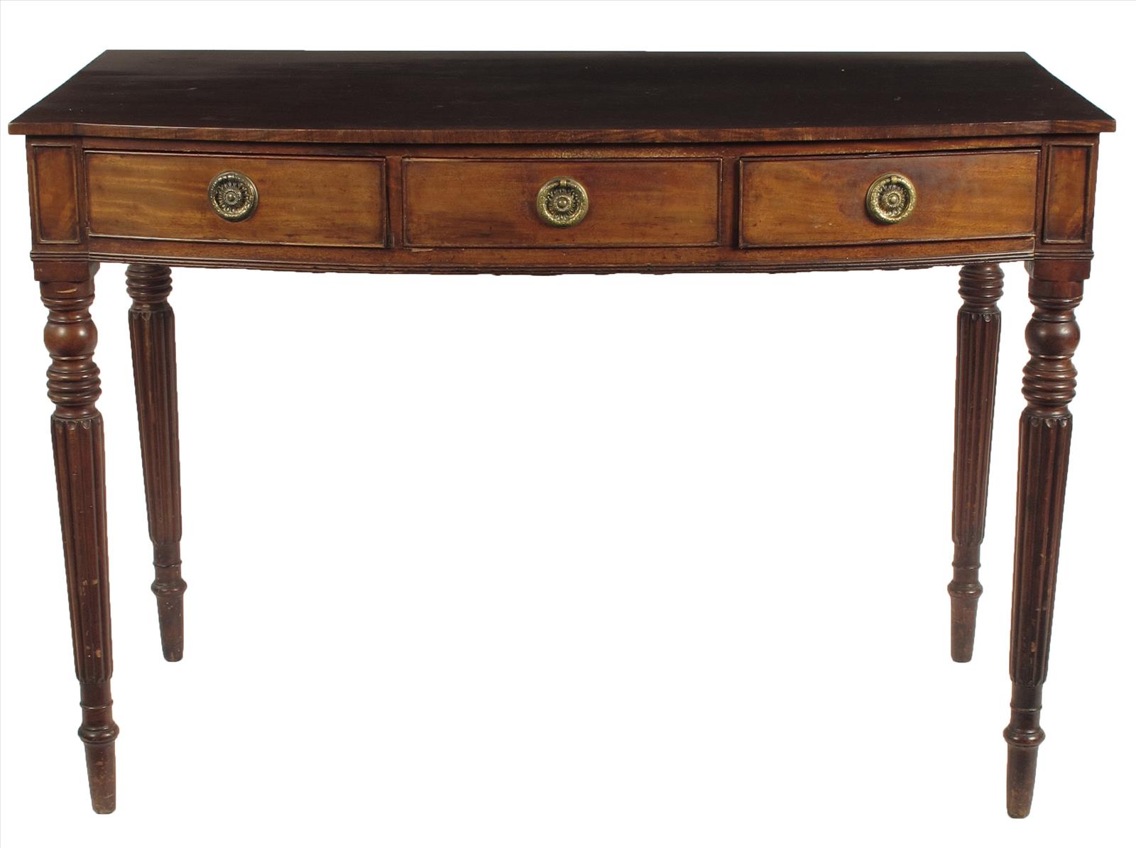 A mahogany bowfront side table, the three drawers with later baize lined divisions, on ribbed tapering legs, early 19th century and later, 30½in (77.4cm) high, 43¾in (111cm) wide, 24in (61cm}) deep.