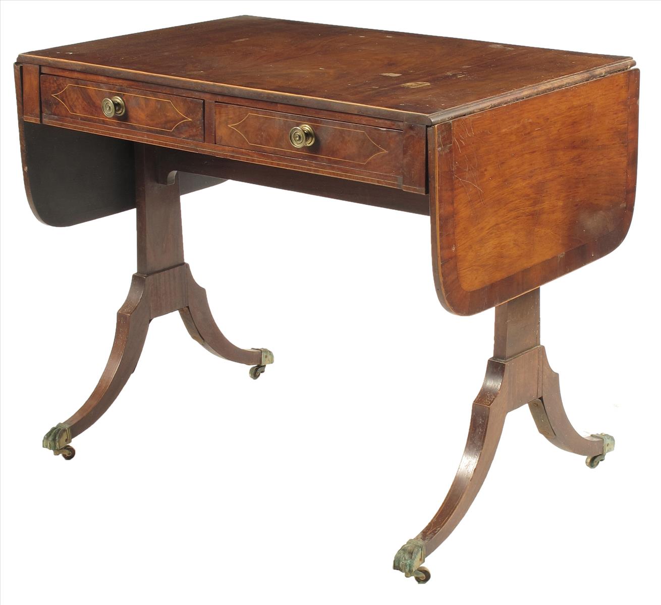 A late George III mahogany sofa table, inlaid stringing, the crossbanded top above twin frieze drawers with false fronts to the reverse, on later brass sabots, 28¾in (72.5cm) high, 34½in (87.5cm) wide, 23½in (59.4cm) deep.