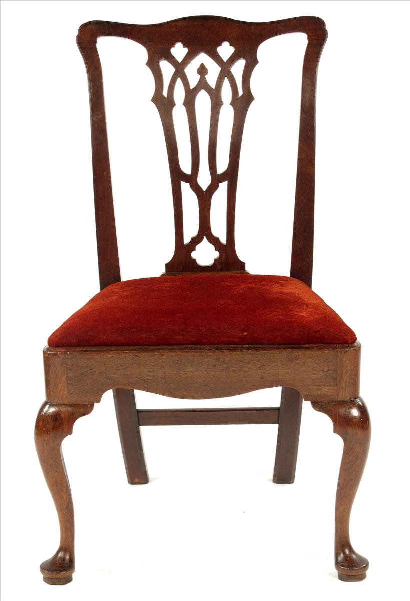 An early George III mahogany side chair, with a pierced Gothic splat above a drop-in seat and cabriole front legs.