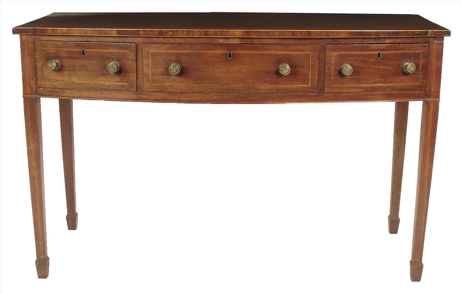 ‡A Regency mahogany bowfront serving table, the top rosewood crossbanded and inlaid stringing, above three oak lined frieze drawers fitted replaced brass handles, 33.5in (85cm) h, 54in (137.5cm) w, 26.25in (66.5cm) d.