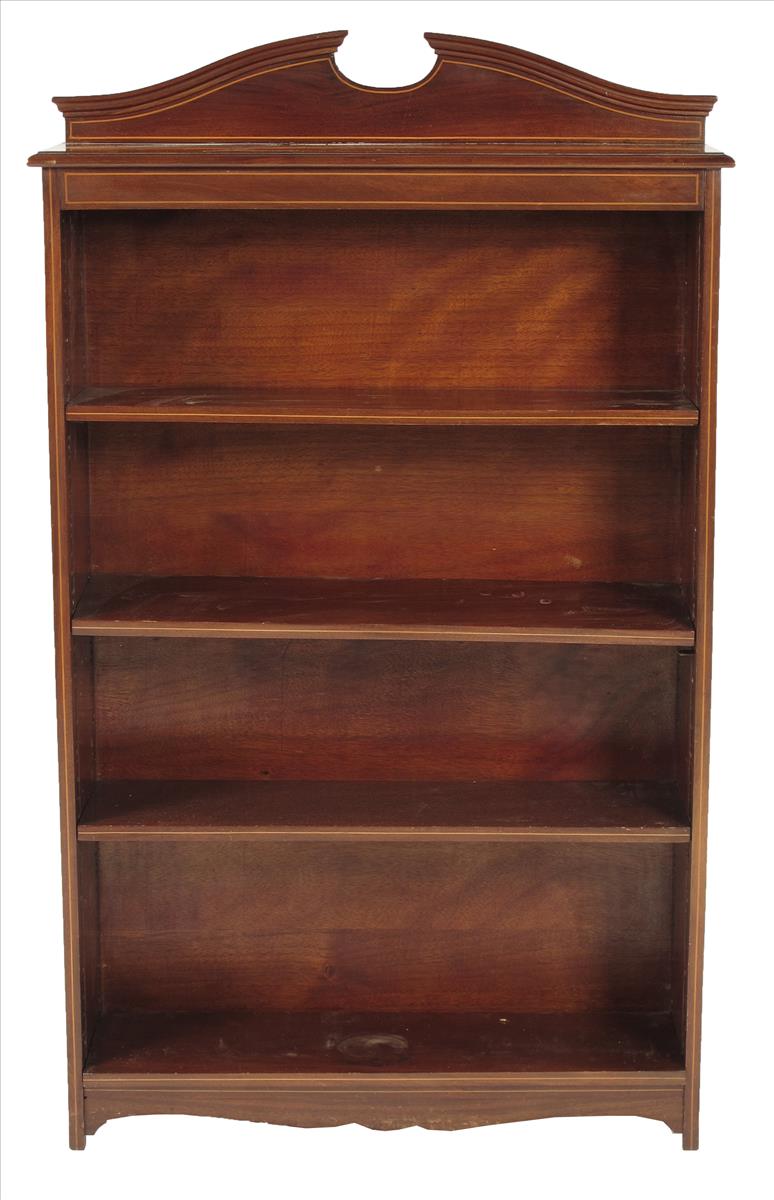 An Edwardian mahogany open bookcase, with stringing and adjustable shelves, 45½in (115.5cm) high, 27in (68.5cm) wide, 7¾in (19.6cm) deep.