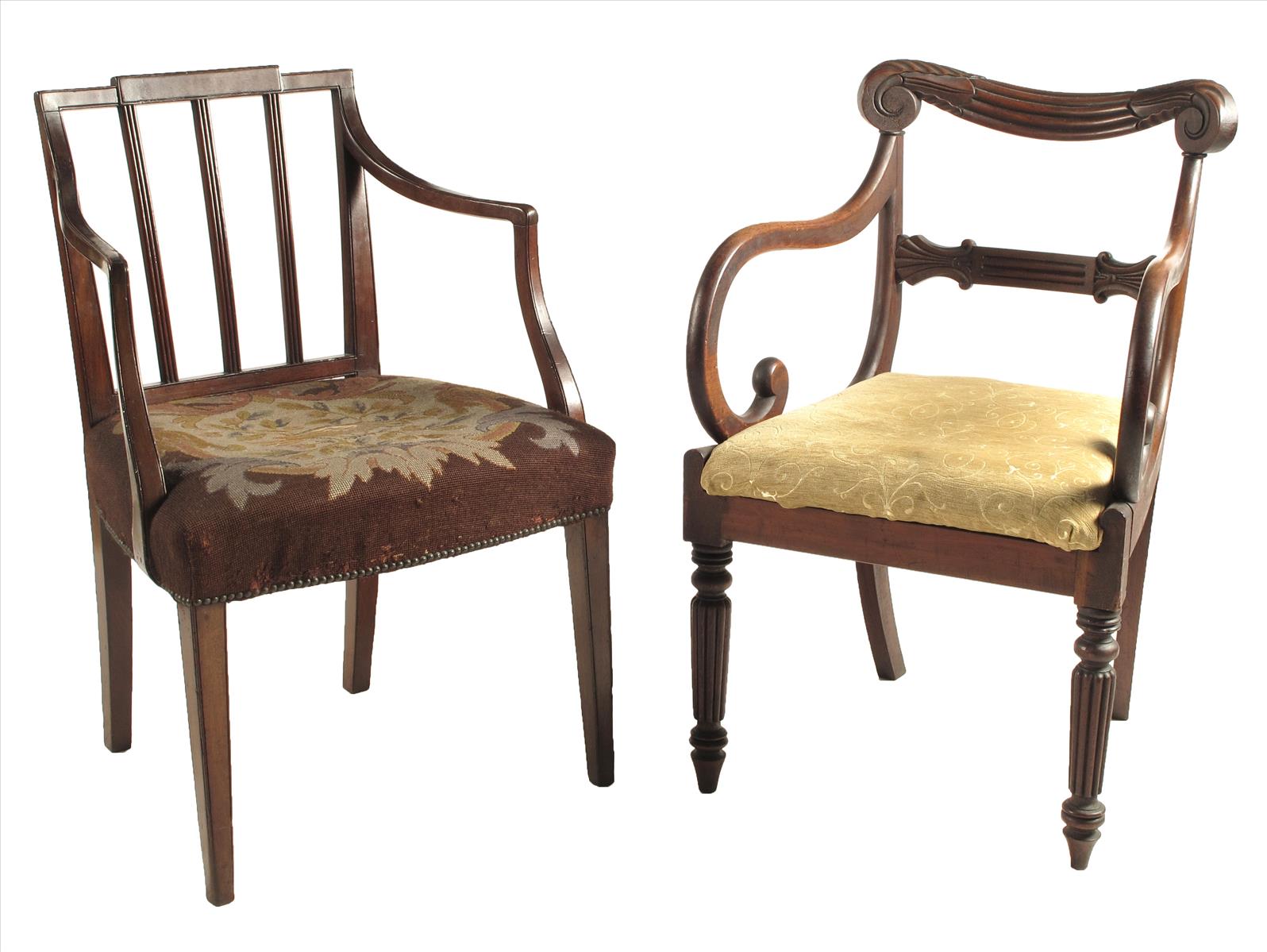 A William IV mahogany open armchair, with a ribbed and leaf carved top rail to a drop-in seat, together with a mahogany open armchair with a tapestry seat. (2)