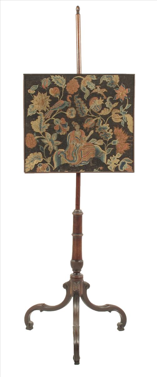 An early George III mahogany pole firescreen, with a needlework panel depicting a lady surrounded by flowers and birds, on a turned and carved triform base, 55¾in (141.6cm) high, 18in (45.8cm) wide.