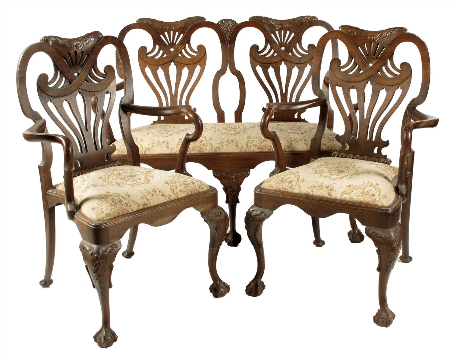 A carved oak double chair back settee in George II style by H. M. Owen, together with a pair of matching open armchairs, each frame signed. (3)