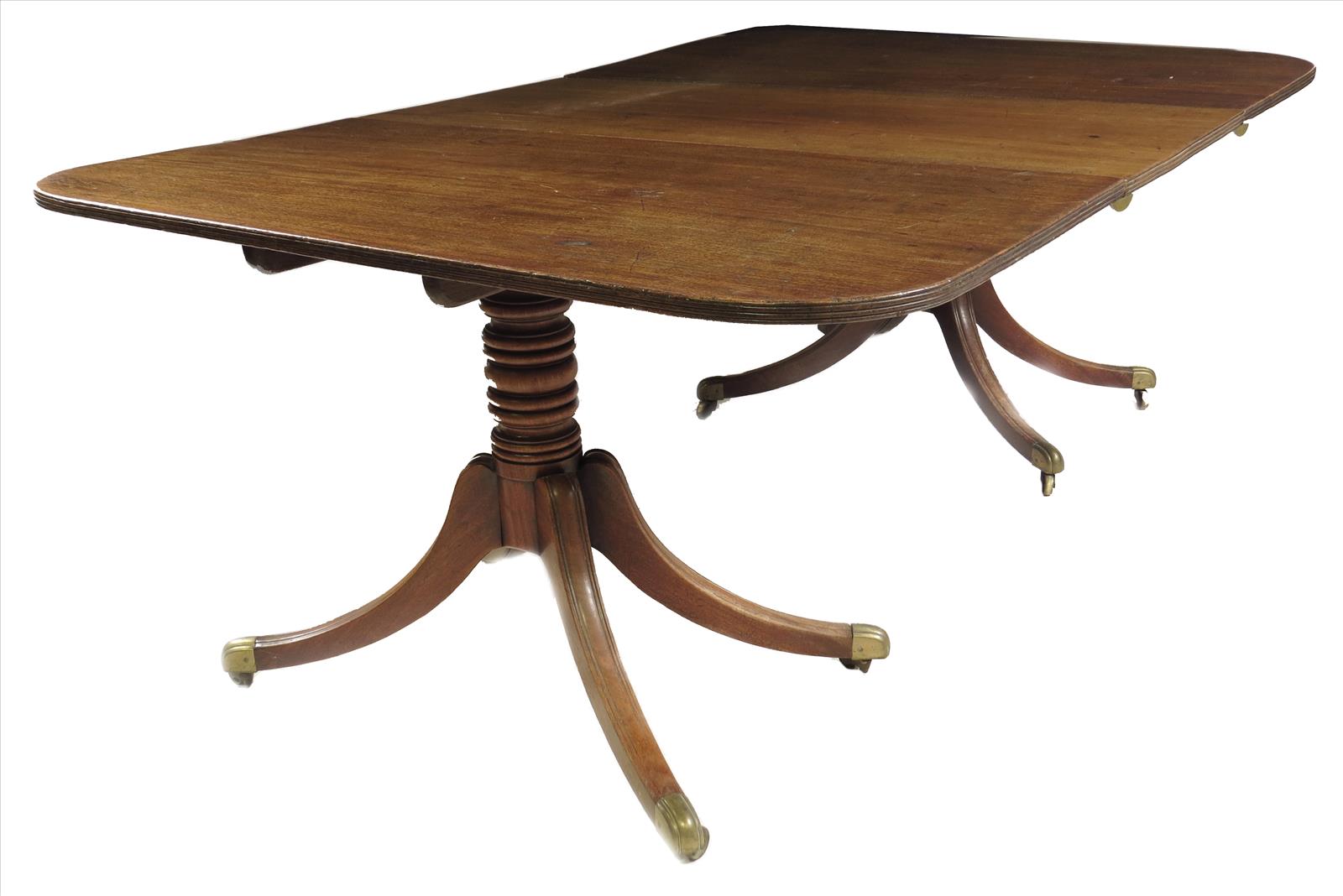 A George IV mahogany dining table, with a reeded edge on turned twin pedestals to splay legs and brass caps and castors, comprising: a pair of 'D' ends and a single leaf, 27½in (69.5cm) high, 73¼in (185.8cm) wide, 50in (126.5cm) deep.