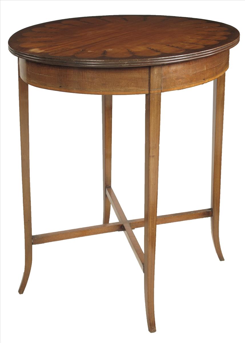 An Edwardian mahogany and satinwood oval occasional table, 29½in (75cm) high, 28in (71.2cm) wide, 23½in (59.3cm) deep.