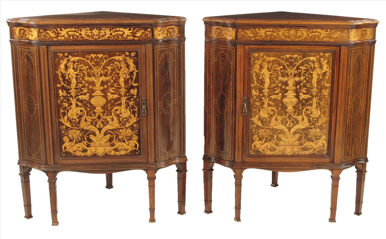 ‡A pair of late Victorian rosewood and marquetry corner cabinets in the manner of Collinson & Lock