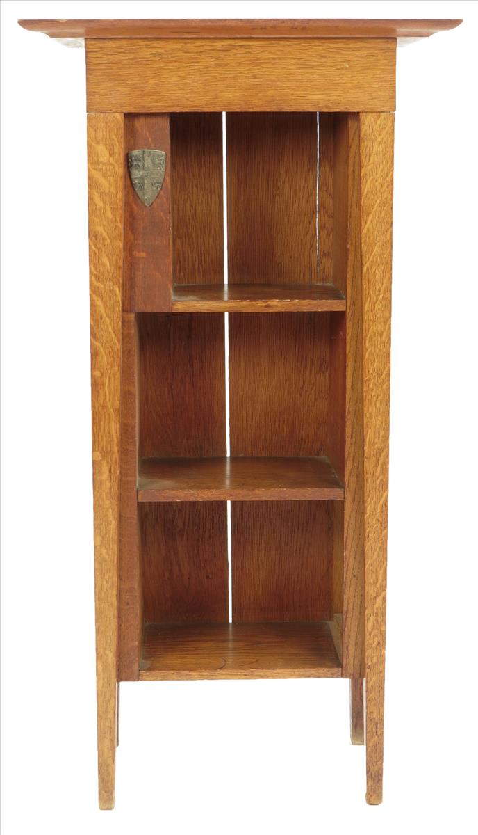An Arts & Crafts oak open bookcase, with an applied metal shield, the back stamped 'RD 504213', 45¾in (116cm) high, 23½in (59.5cm) wide, 11¾in (30cm) deep.