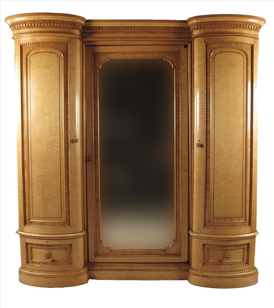 A Victorian maple bedroom suite by Marsh & Jones, comprising an inverted breakfront wardrobe, the detachable dentil cornice above a pair of bowfront panelled doors with hanging space and a drawer below, flanking a mirrored door enclosing four slides and three drawers, 87¾in (220.8cm) high, 85in (215.6cm) wide, 32in (81cm) deep, a dressing chest with a central cheval mirror flanked by a pair of pedestals each fitted with six drawers with ebonised dot inlay, 64½in (163.7cm) high, 63in (159.8cm) wide, 21½in (54.5cm) deep, a marble topped pot cupboard and a cane seated chair and stool, with printed paper labels 'MARSH AND JONES, LATE KENDELL & CO.', inscribed in pencil with workmen's signatures 'WEBSTER', one illegible and numbers '1882 and 1885'. (5)