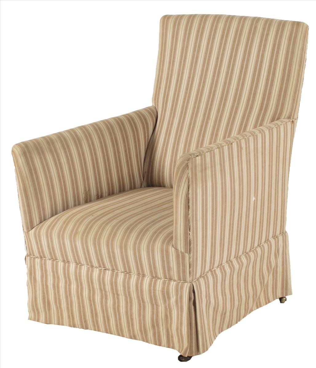 An Edwardian easy armchair, on mahogany tapering legs on brass castors, one missing.