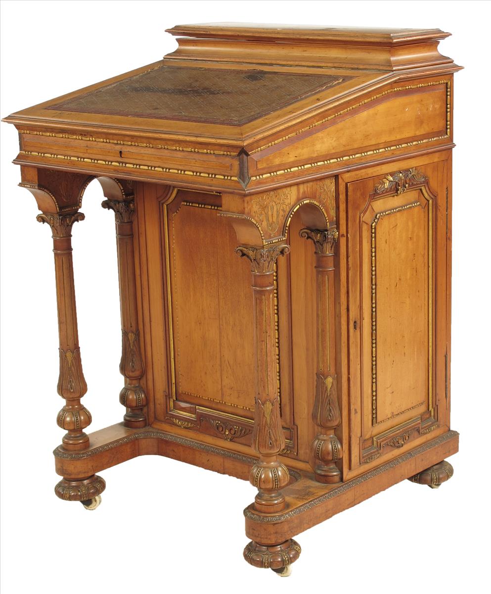A Victorian satin birch and parcel gilt Davenport, the hinged top revealing divisions, a pen tray and inkwell compartments, to a leather lined fall revealing a vacant interior, the right side with a panel door enclosing four drawers with sunken brass handles, the door and fall with Chubb patent brass locks, the front with carved Corinthian capital columns, on lobed bun feet to ceramic castors, 31¾in (80.5cm) high, 20¾in (52.6cm) wide, 21½in (54.5cm) deep.