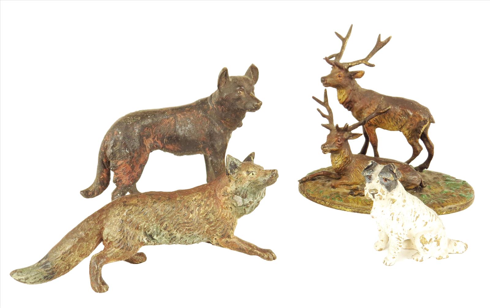 Four cold painted animalier bronzes; a fox, 4in (10cm) long, a German shepherd, 3¼in (8.2cm) long, a seated terrier, 1½in (3.8cm) high, and a group of two stags, 3in (7.6cm) high. (4)
