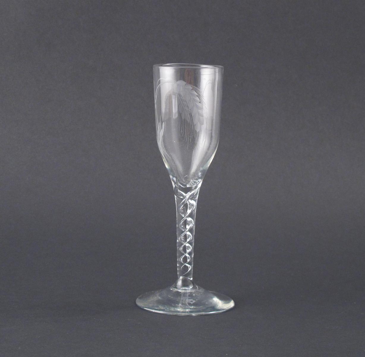 An ale glass c.1760, the slender funnel bowl engraved with crossed stems of barley, raised on a mercury airtwist stem, 17cm.
