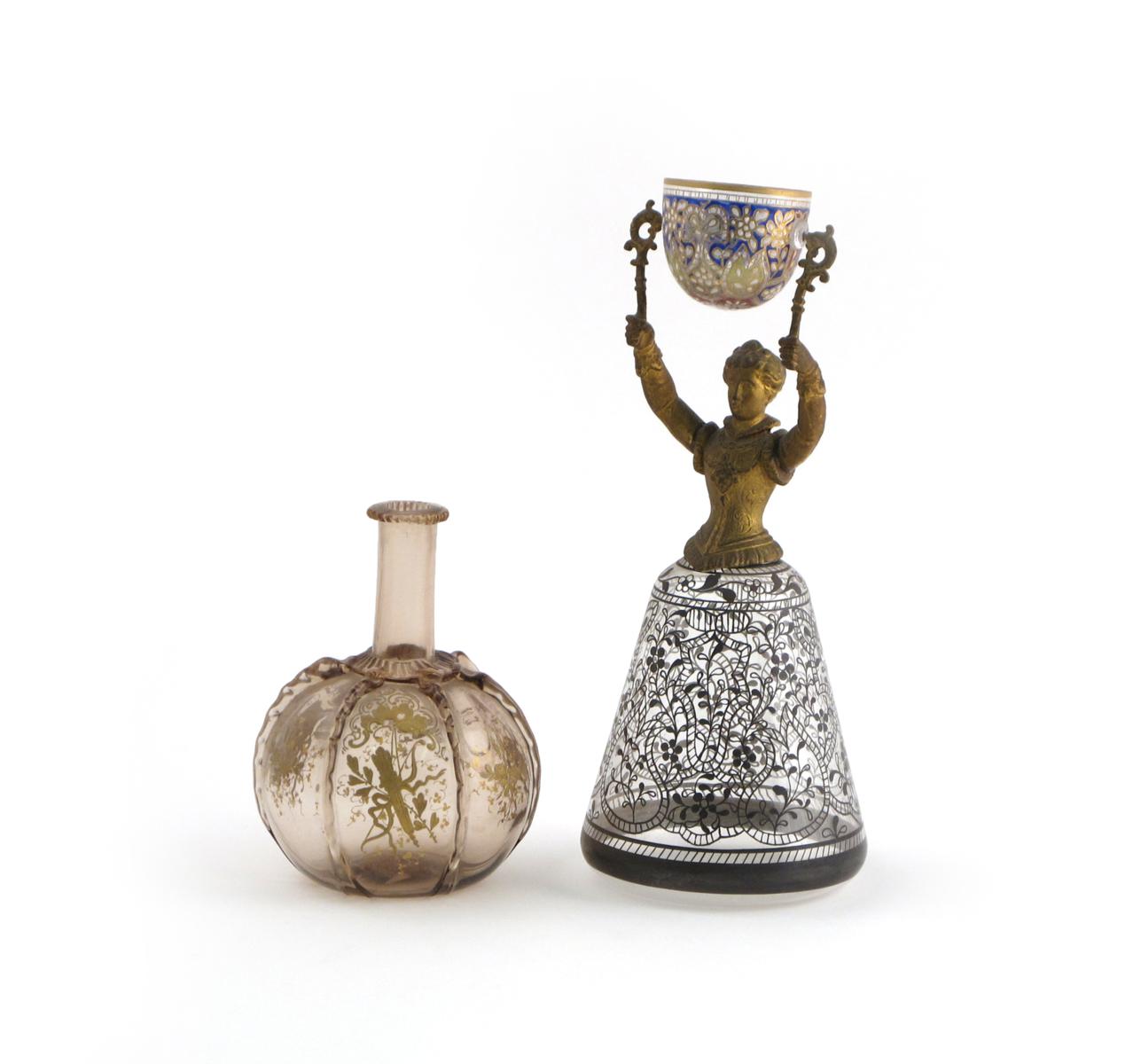 A Continental imitation of a trick glass 19th century, formed as a woman with a hollow glass skirt, her upper torso in gilt metal, supporting a rotating glass piggin, and a glass flask with pinched trailed decoration and raised gilt designs, 28cm max. (2)