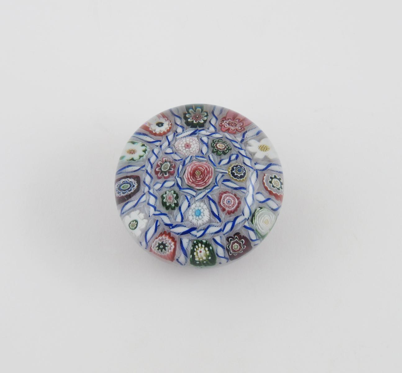 A large Clichy barber's pole paperweight mid 19th century, a green and pink 'Clichy rose' cane to the centre, with two other rows of canes, separated by blue and white pole lengths with latticino wrapping, a small chip to the foot, 7cm dia. x 5cm high.