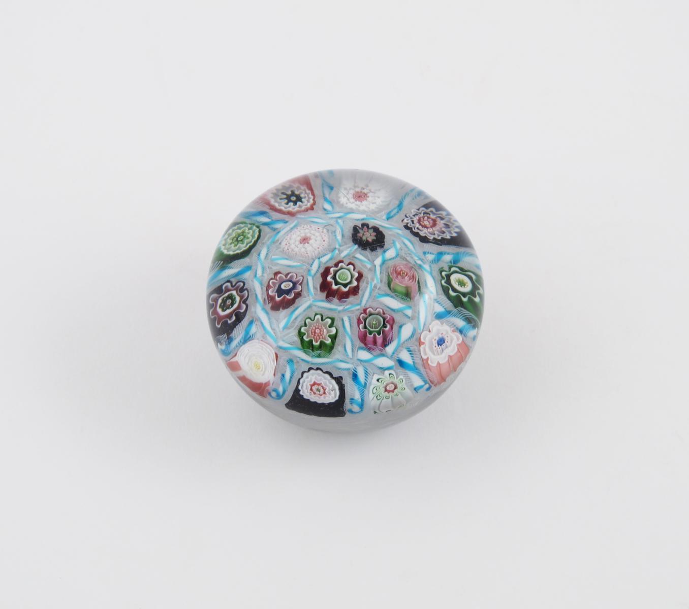 A Clichy barber's pole paperweight mid 19th century, set with three rows of canes including a green and pink 'Clichy rose', separated by turquoise and white pole lengths with latticino tubes and wrapping, a small surface dint, 6.5cm dia. x 4.7cm high.