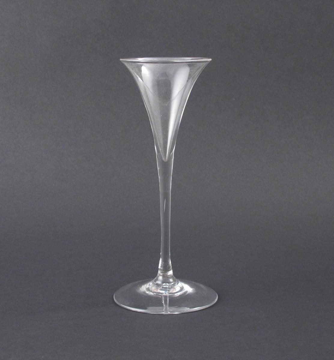 A fine toasting glass mid 18th century, the flared bowl rising from a delicate plain stem above a wide foot, 19.5cm.