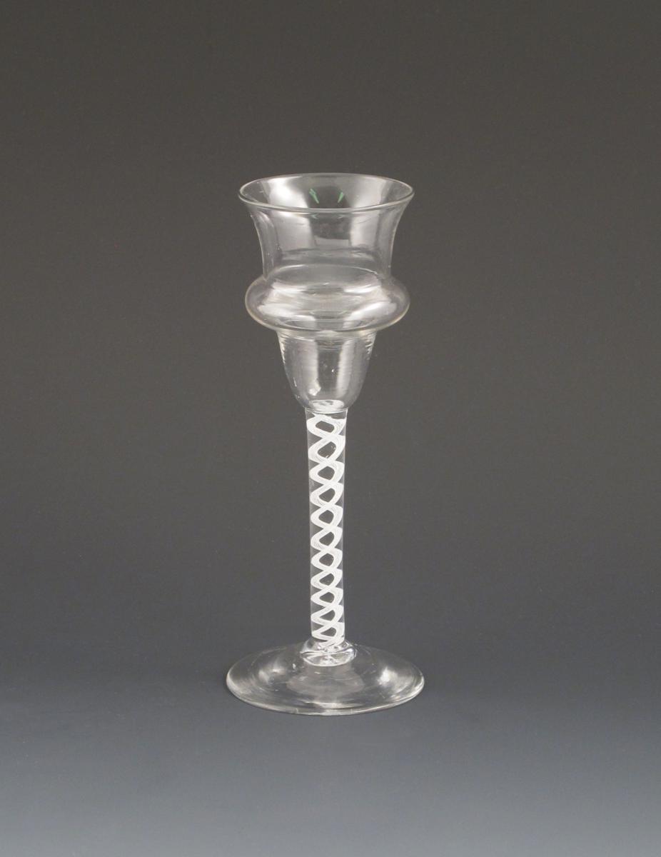 A rare wine glass c.1760, the narrow funnel bowl with an unusual flattened knop, raised on a slender opaque twist stem, 16.5cm.