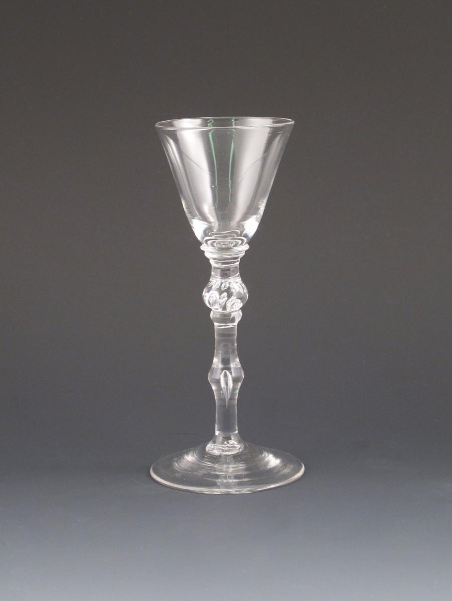 A Newcastle light baluster wine glass mid 18th century, the funnel bowl raised on a multiple knopped stem, one knop with two rows of tears, the lower with a single teardrop, 16cm.