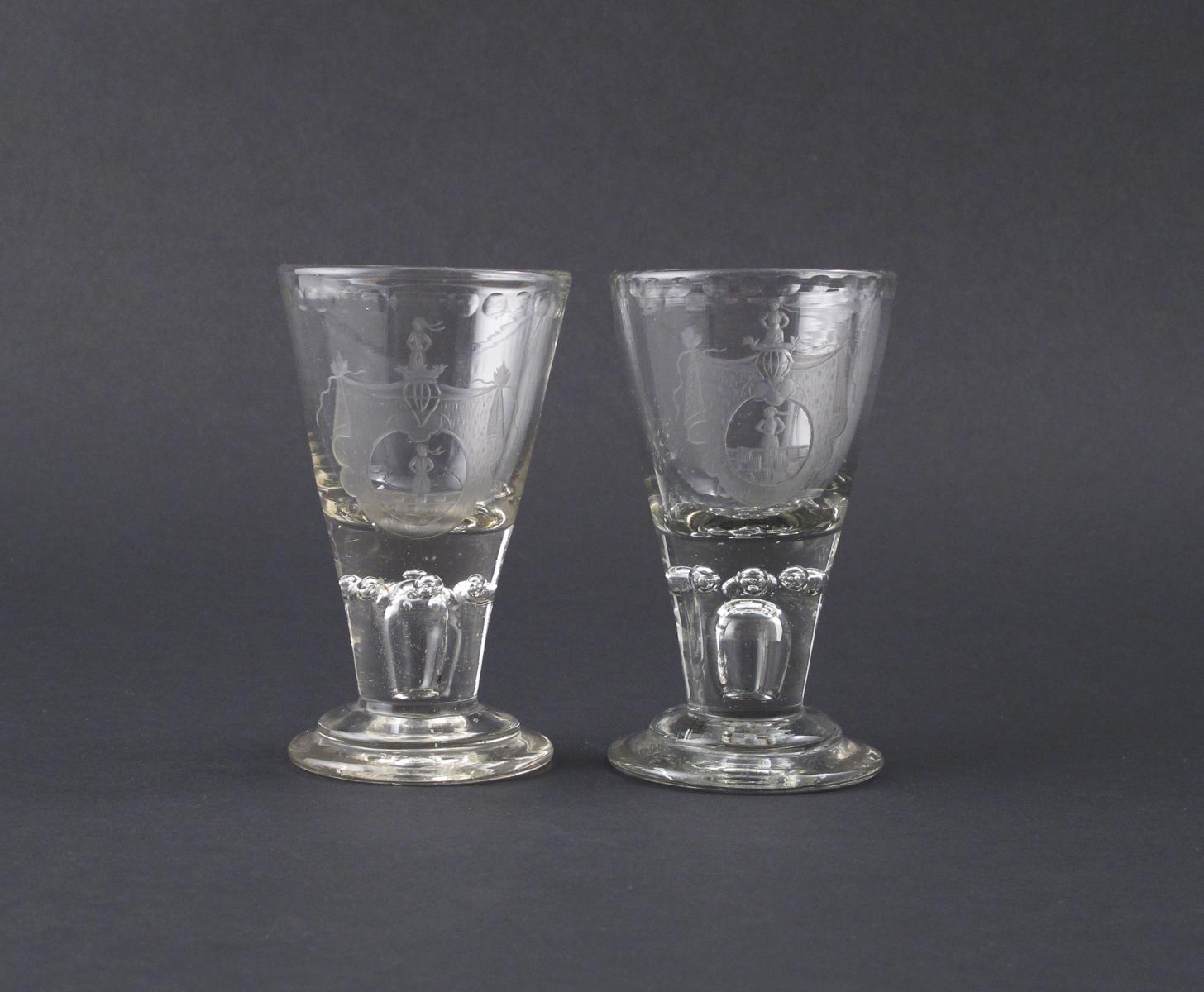 A pair of Lauenstein firing glasses c.1760-70, the flared bowls drawn from stems with a row of small tears enclosing a large teardrop, above a stepped foot, the bowls engraved with a figure standing behind a wall within a fabric cartouche, each below a band of polished circles, 11.5cm. (2)