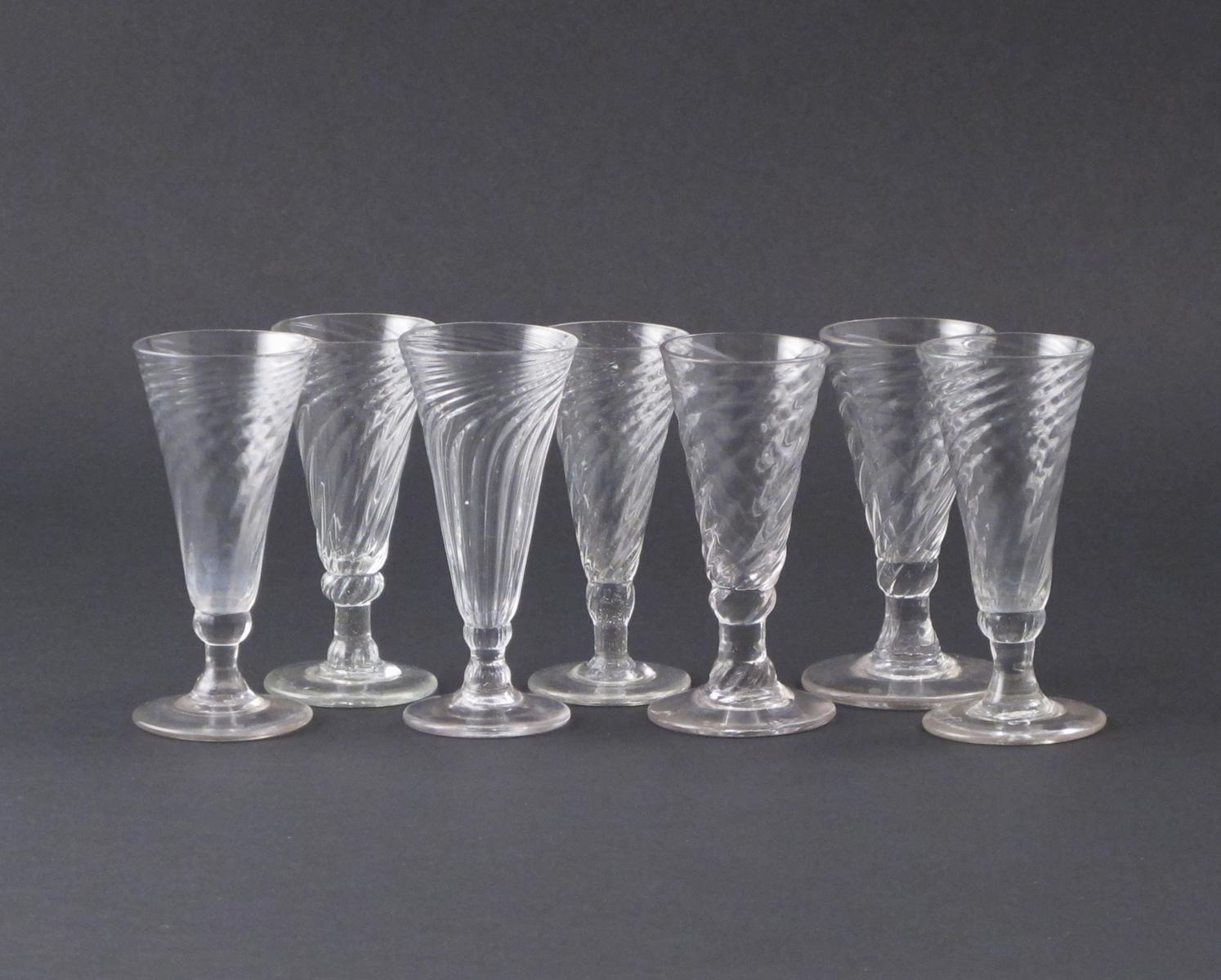 Seven dwarf ale glasses 19th century, with spiral-moulded bowls, raised on short knopped stems with wrythen moulding, 13cm. (7)