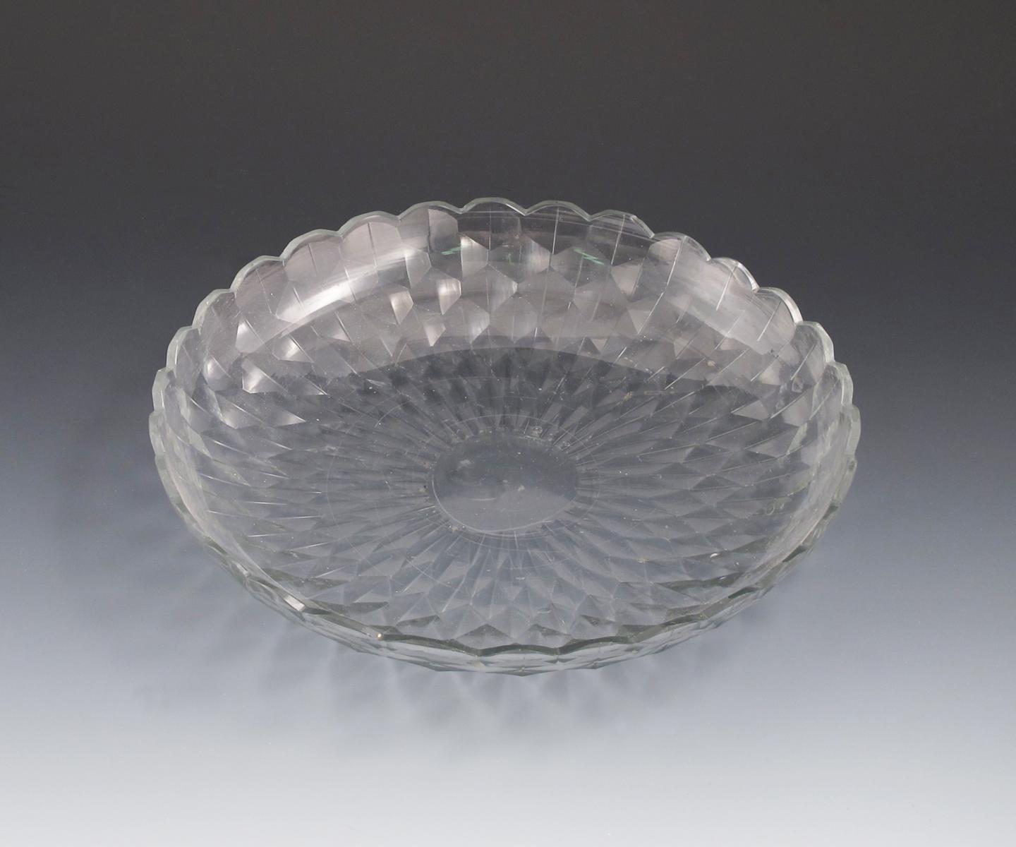 A large and unusual shallow glass dish late 18th/early 19th century, with scallop-edged rim, the underside cut with bands of tapering diamonds, 26cm dia.