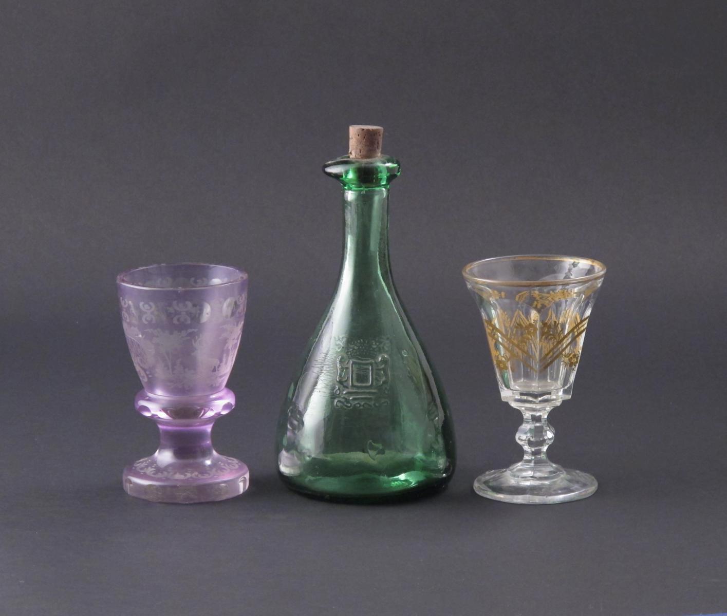 A Bohemian glass goblet 19th century, flashed in amethyst and cut with a stag and shell panels, a hexagonal cut goblet with gilt garlands, and a Continental green glass pouring bottle moulded with an armorial, 23cm max. (3)
