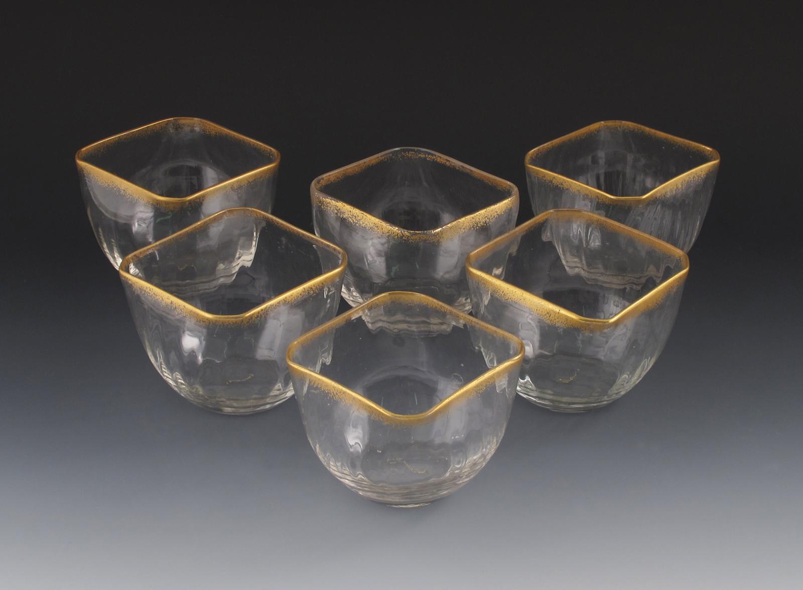 A set of six unusual glass finger bowls 19th century, the square rims with a powdered gilt effect, billowing out into fluted round bodies, raised gilt 'Crook's' marks to the bases, 11cm dia. (6)