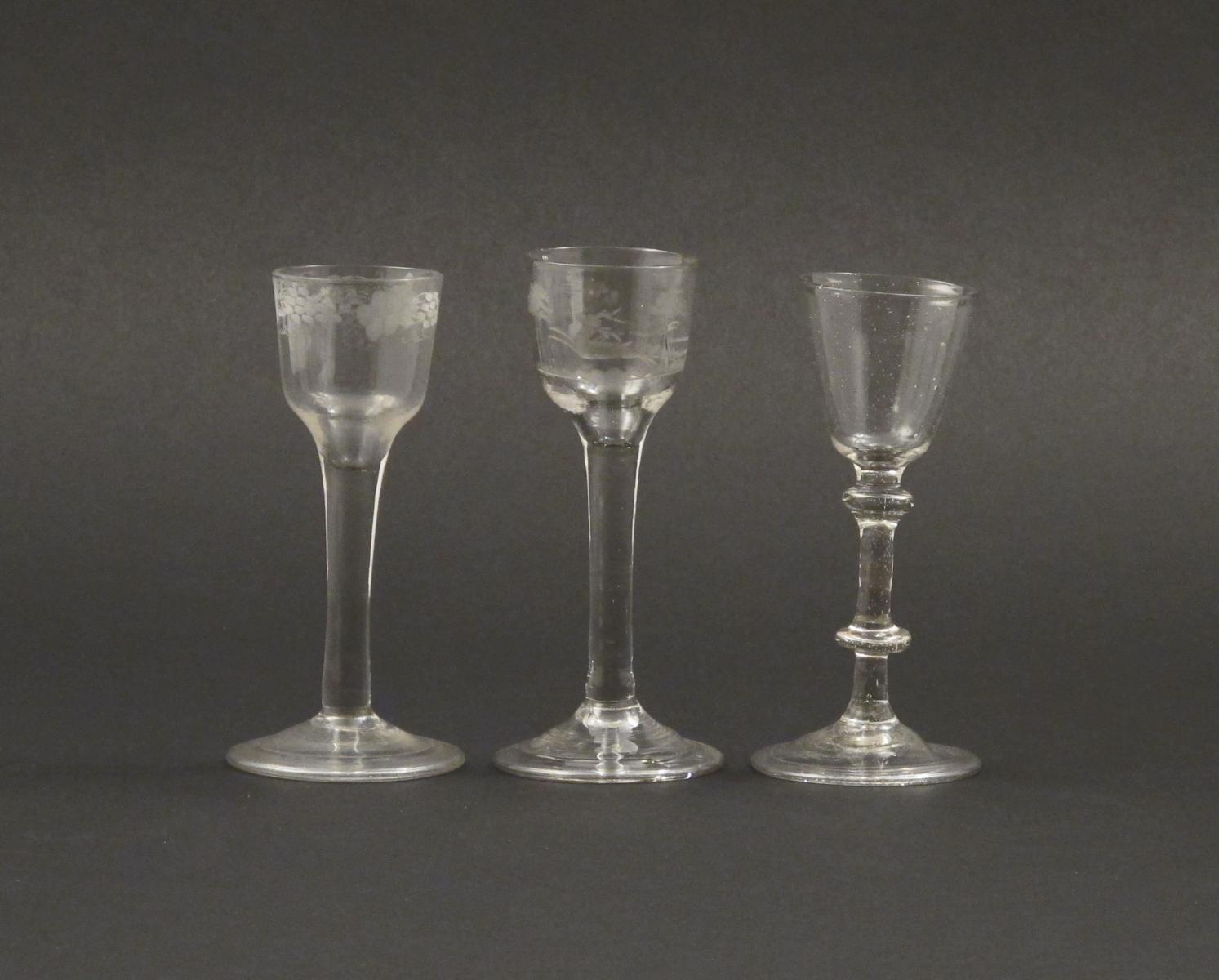 Three wine glasses mid 18th century, all raised on folded feet, two with plain stems, one with a knopped stem, one bowl engraved with a hound chasing a stag, another with continuous grapevine, 14.7cm max. (3)