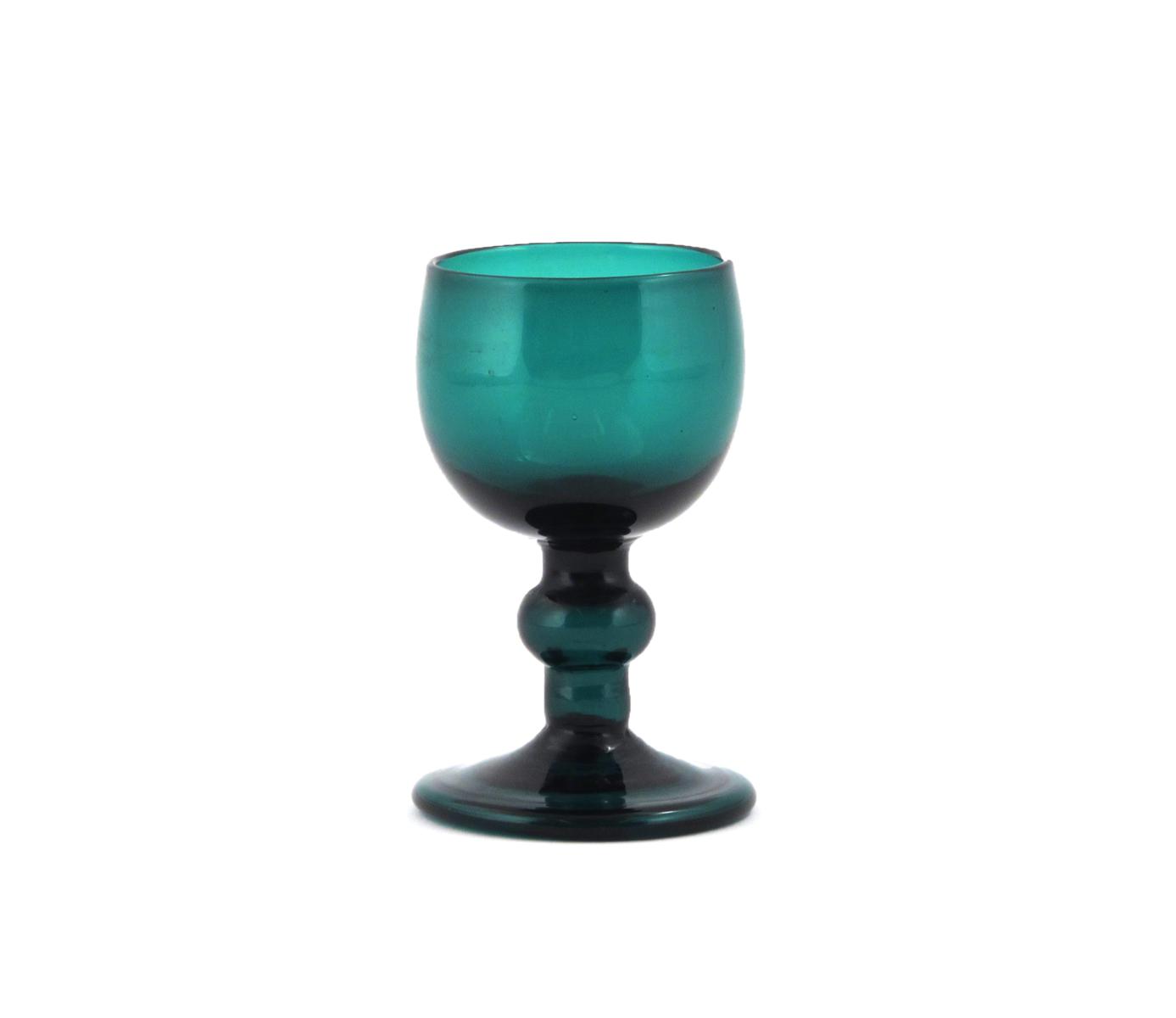 An emerald green wine glass c.1755-60, with rounded bowl raised on a short knopped stem above a folded foot, 10.5cm.